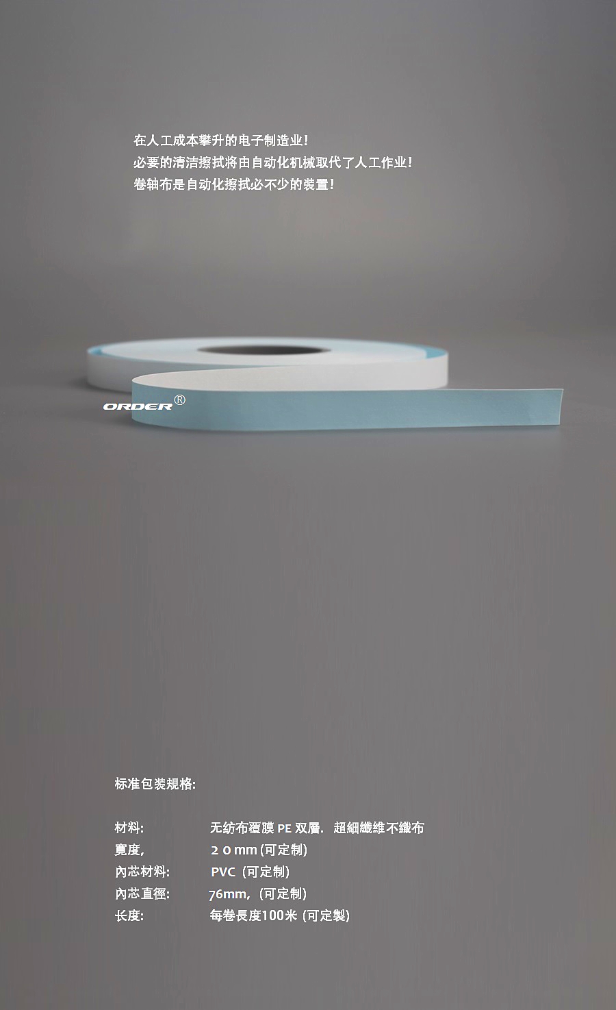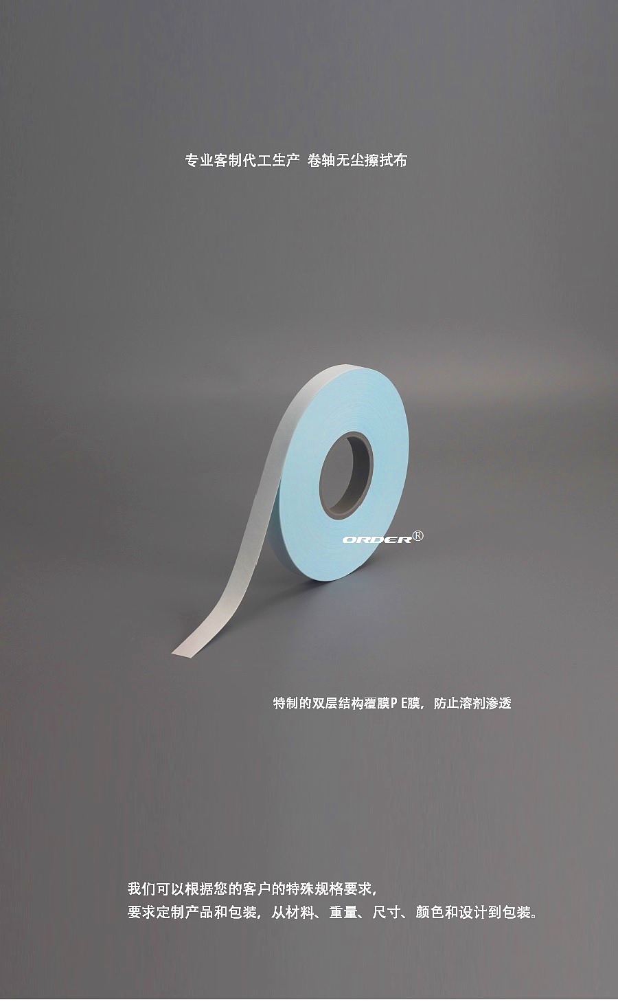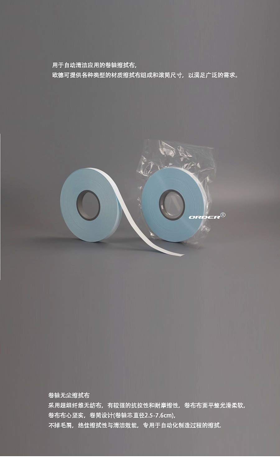 采用超细纤维织物和特殊无纺材质,无尘、毛屑产生量极低,卷筒设计,有较强的抗拉性,令你降低使用成本。