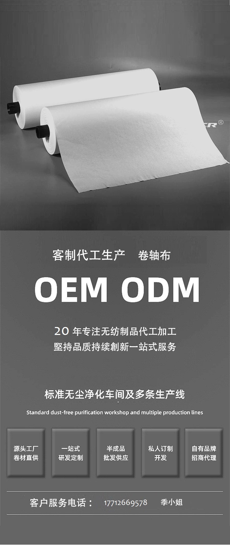 2、有20年以上制造、销售工业、电子产业专用擦拭纸/布产品的丰富经验;专业无纺布材料的应用,并库存众多的不同材料,以满足不同客户対材料的需求选择