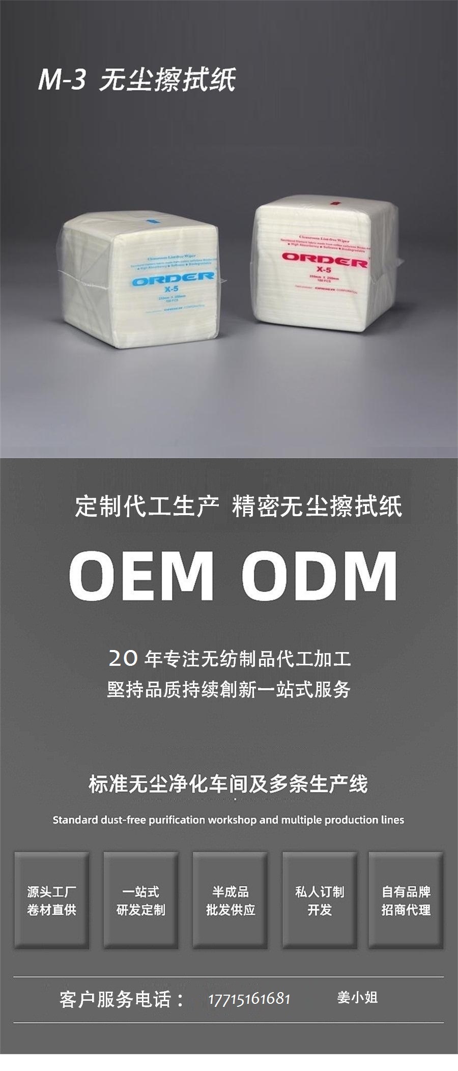 阅读更多可定制尺寸 我们可以根据您的要求定制产品和包装,从材料、重量、尺寸、颜色和设计到包装。 描述 ORDER 欧德公司提供 新科技产品 ORDER欧德公司提供新科技产品,经高压、高温的工业级高效擦拭布提供了抹布与 一般擦拭纸难以比拟的擦拭效果,确保擦拭过程安全不刮伤,它低纤维尘屑的特性简化工业流程,安心使用的同时也增加了效率。 ORDER欧德公司新科技产品高效能多用途擦拭布是由进口...