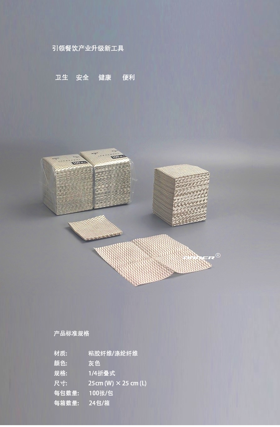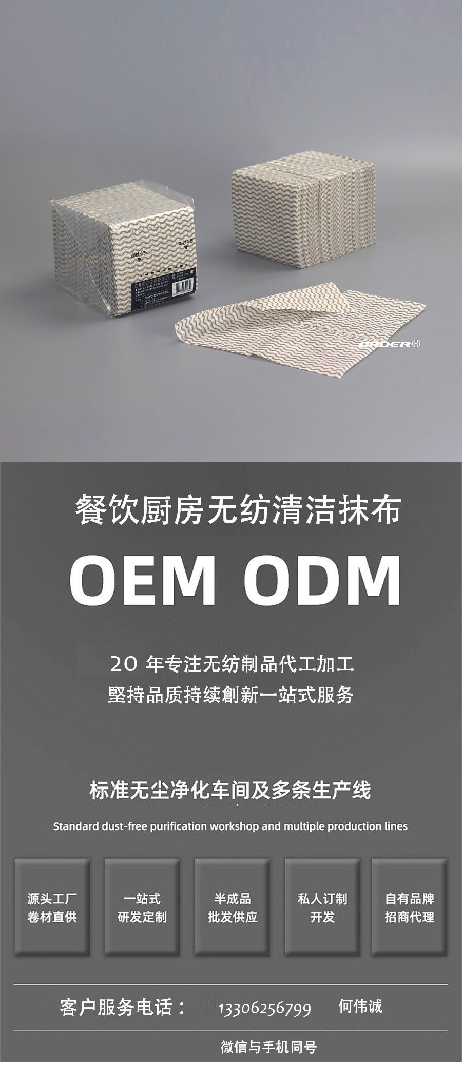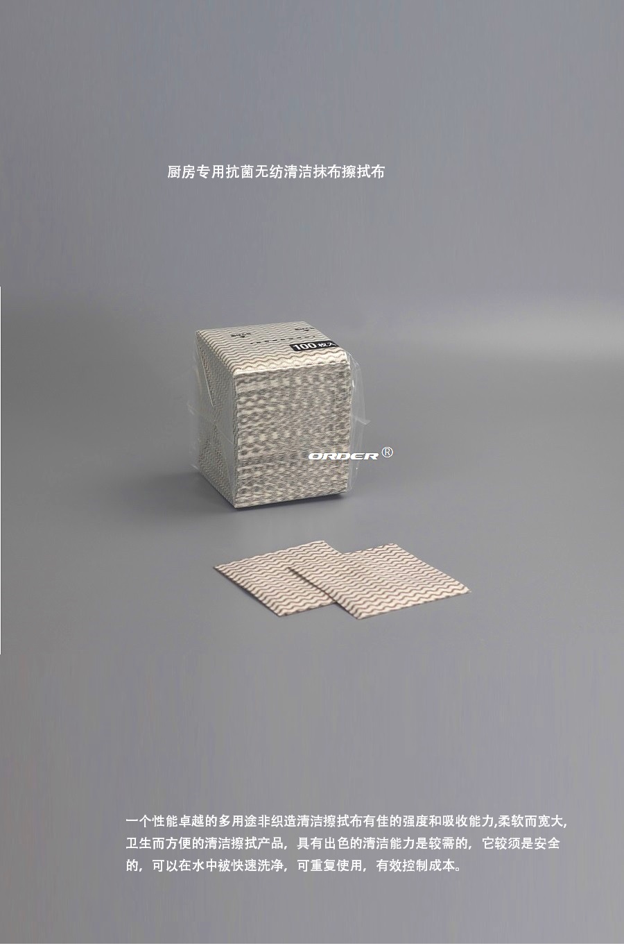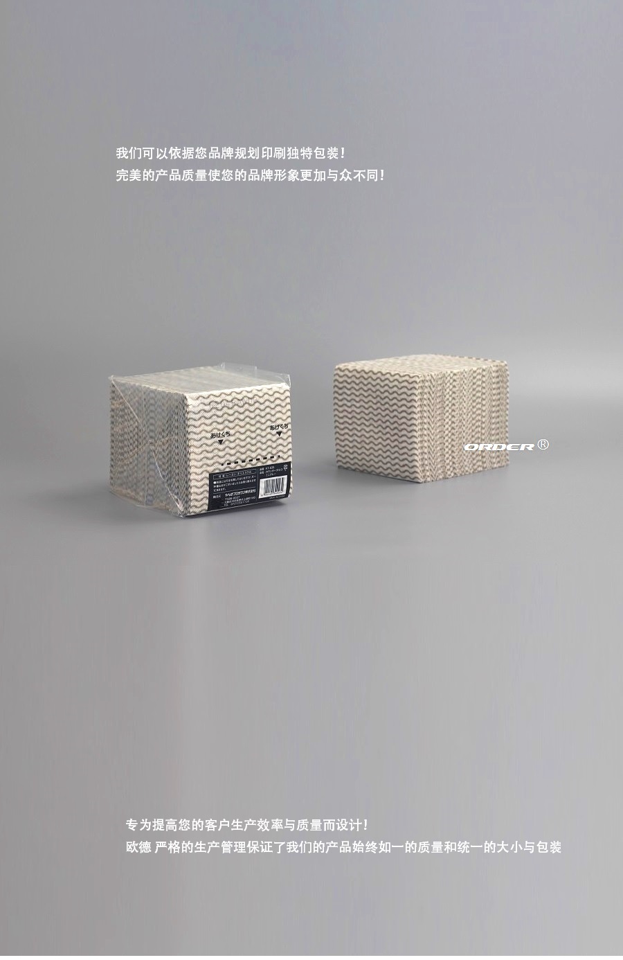 阅读更多可定制尺寸 我们可以根据您的要求定制产品和包装,从材料、重量、尺寸、颜色和设计到包装。 描述 ORDER 欧德公司提供 新科技产品 ORDER欧德公司提供新科技产品,经高压、高温的工业级高效擦拭布提供了抹布与 一般擦拭纸难以比拟的擦拭效果,确保擦拭过程安全不刮伤,它低纤维尘屑的特性简化工业流程,安心使用的同时也增加了效率。 ORDER欧德公司新科技产品高效能多用途擦拭布是由进口...