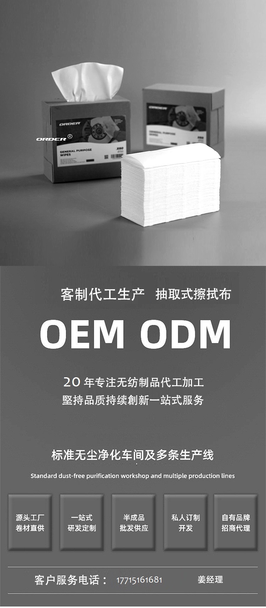 阅读更多可定制尺寸 我们可以根据您的要求定制产品和包装,从材料、重量、尺寸、颜色和设计到包装。 描述 ORDER 欧德公司提供 新科技产品 ORDER欧德公司提供新科技产品,经高压、高温的工业级高效擦拭布提供了抹布与 一般擦拭纸难以比拟的擦拭效果,确保擦拭过程安全不刮伤,它低纤维尘屑的特性简化工业流程,安心使用的同时也增加了效率。 ORDER欧德公司新科技产品高效能多用途擦拭布是由进口...