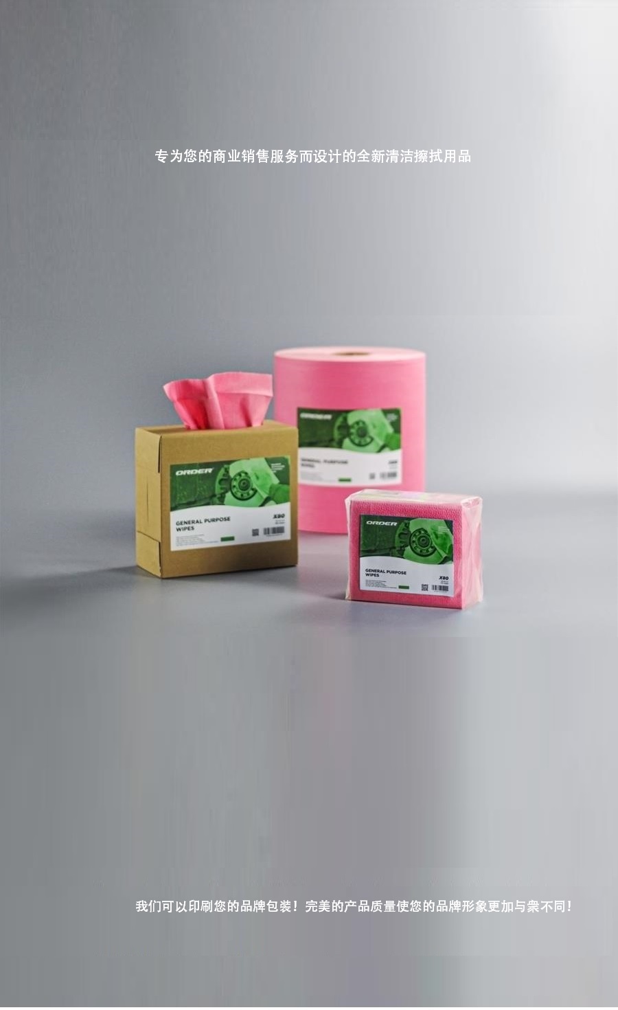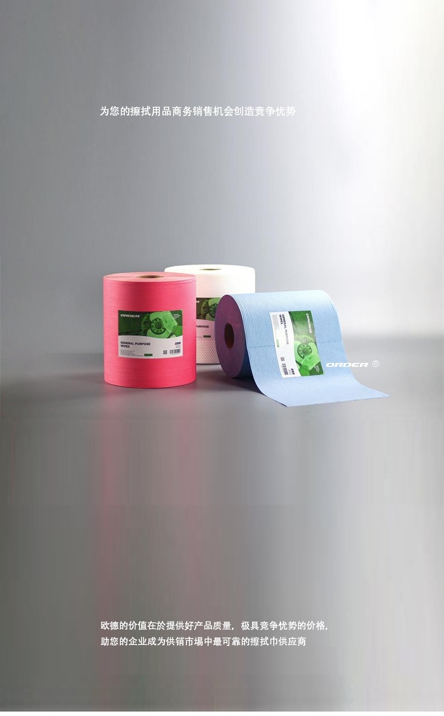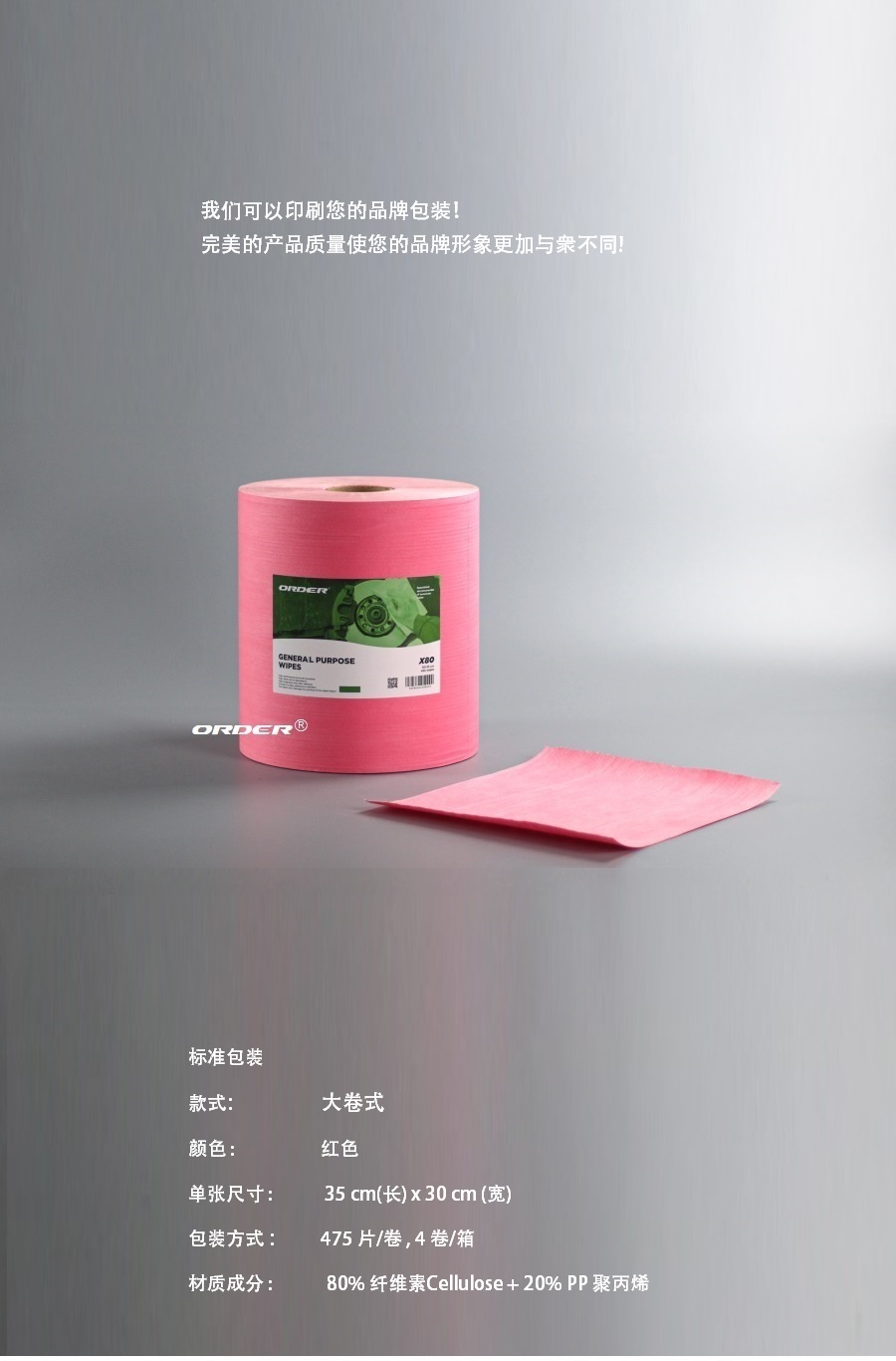 阅读更多可定制尺寸 我们可以根据您的要求定制产品和包装,从材料、重量、尺寸、颜色和设计到包装。 描述 ORDER 欧德公司提供 新科技产品 ORDER欧德公司提供新科技产品,经高压、高温的工业级高效擦拭布提供了抹布与 一般擦拭纸难以比拟的擦拭效果,确保擦拭过程安全不刮伤,它低纤维尘屑的特性简化工业流程,安心使用的同时也增加了效率。 ORDER欧德公司新科技产品高效能多用途擦拭布是由进口...