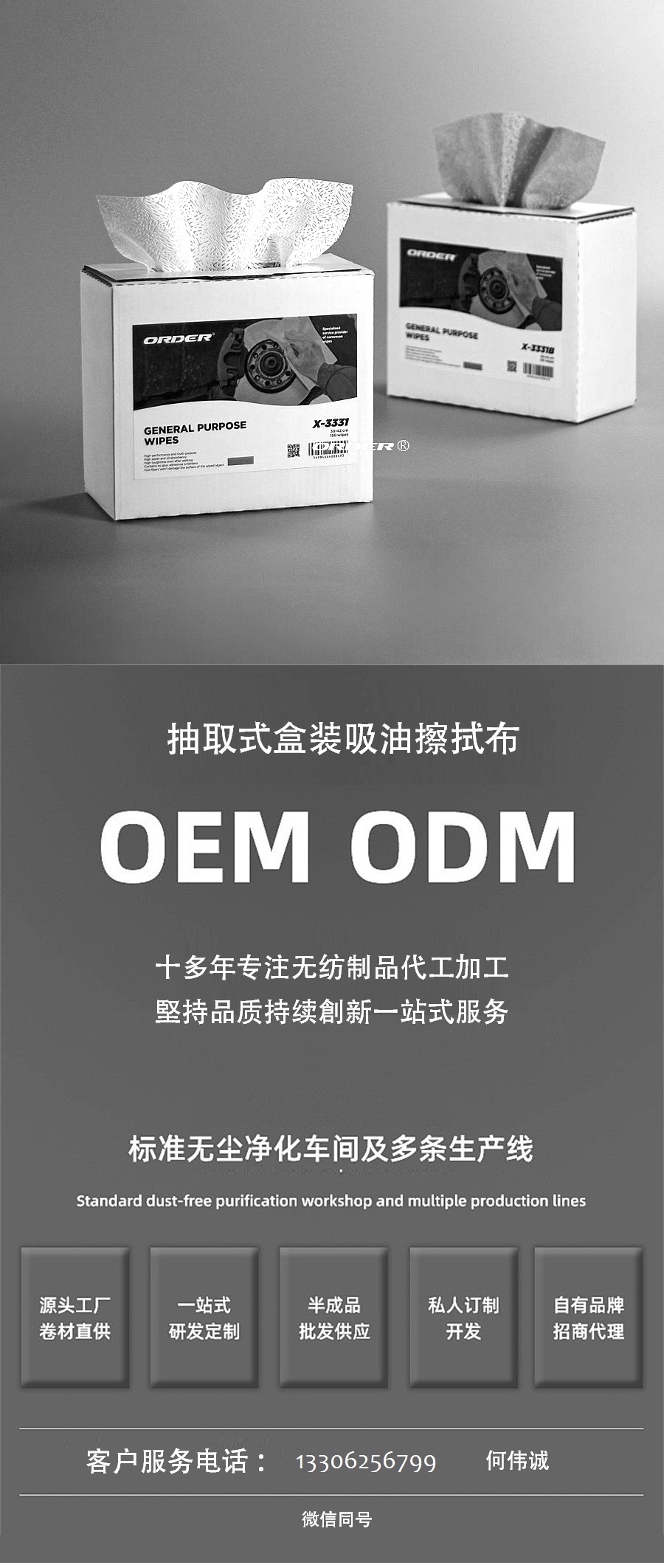 所有ORDER擦拭布均由我们专有的聚丙稀材料制造,它由柔软、吸收力强的纤维和牢固的无纺布组成。