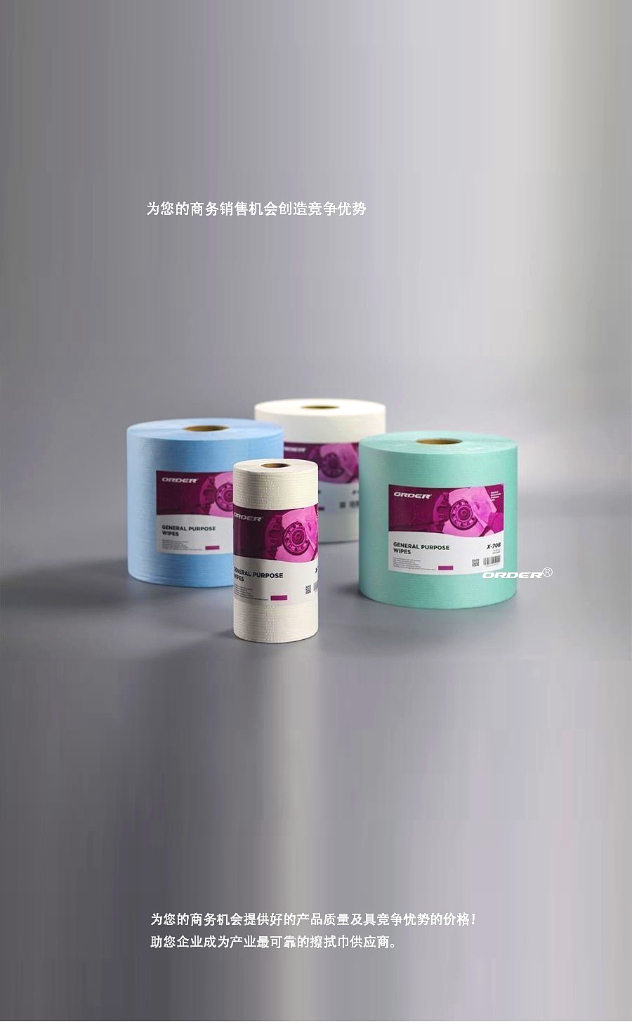 ORDER欧德公司提供新科技产品,经高压、高温的工业级高效擦拭布提供了抹布与 一般擦拭纸难以比拟的擦拭效果,确保擦拭过程安全不刮伤,它低纤维尘屑的特性简化工业流程,安心使用的同时也增加了效率。