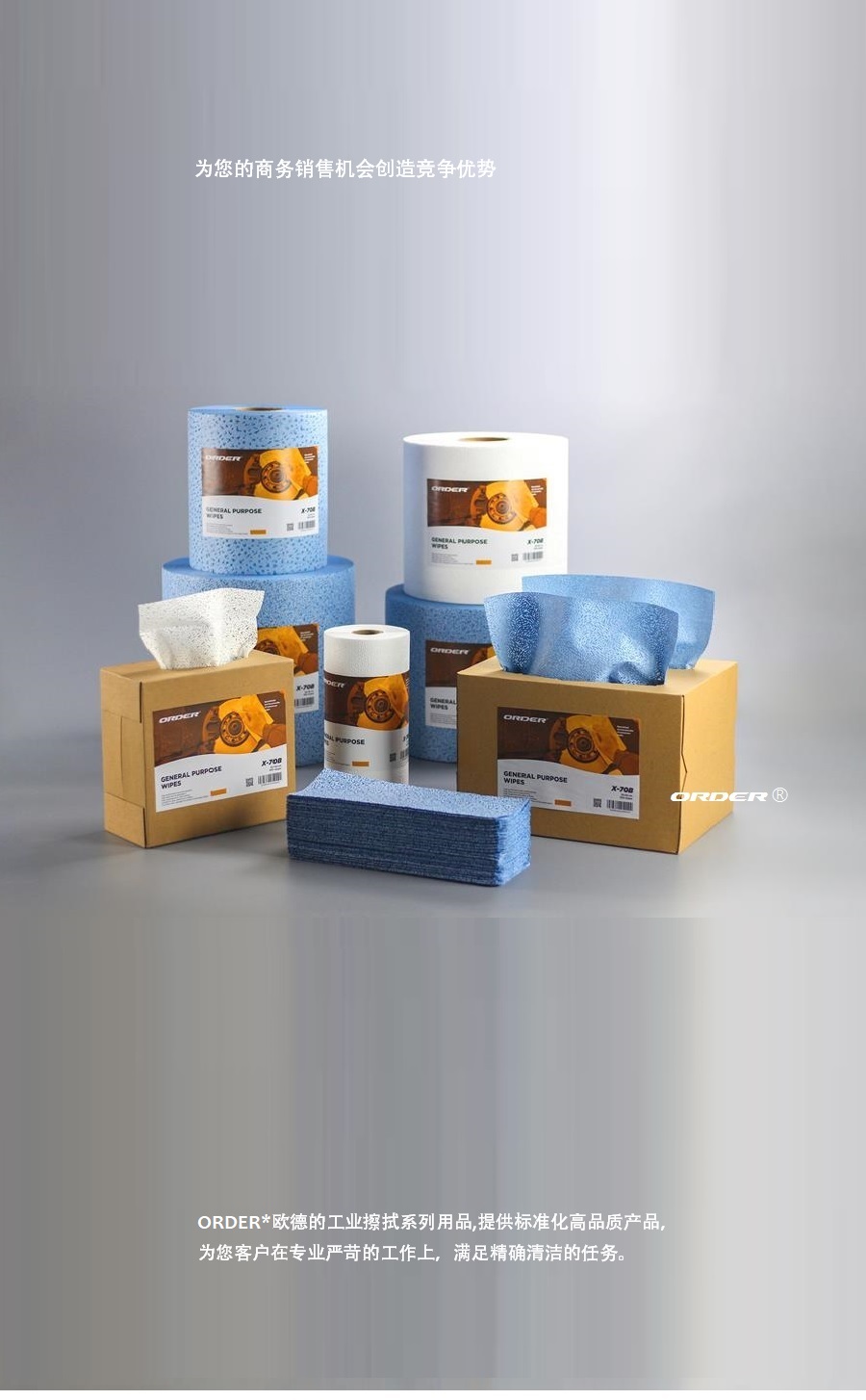 所有ORDER擦拭布均由我们专有的聚丙稀材料制造,它由柔软、吸收力强的纤维和牢固的无纺布组成。
